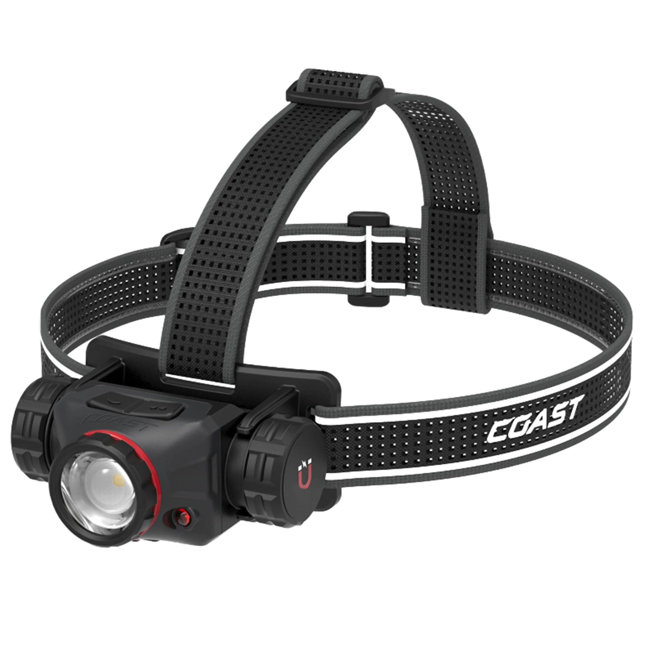 På siden sidder magneten. Ikke skjult. Ikke forklaret væk. Den er der, fordi lygten skal kunne smides op på stål, når den ikke længere skal sidde på hovedet. Motorhjelm. Reol. Maskinstativ. Værkstedsbænk.